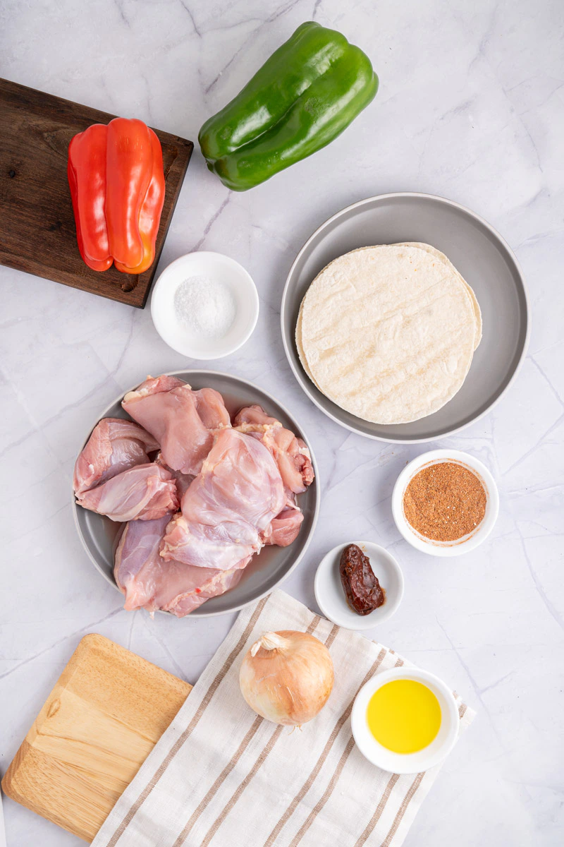 To make these air fryer chicken fajitas you’ll need is a few simple ingredients. For this recipe, we use boneless skinless chicken thighs, red and green peppers, yellow onions, fajita seasoning, salt, and pepper.