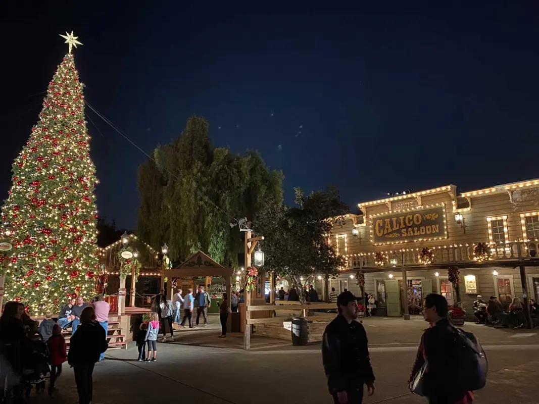 Holiday Lights cover the Calico Saloon, a perfect backdrop for fun photos!